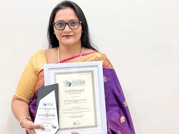 Principal Director Dr. Deepa Shah Of Dr Shah’s™ Advance Homeopathy recipient of " BEST HOMEOPATHIC DERMATOLOGIST" OF THE YEAR 2023 " at Radisson Blu Dwarka Delhi on 23rd July 2023 for her Outstanding Contribution in Hair & Skin Care at Par Excellence in the feilds of Homeopathy.