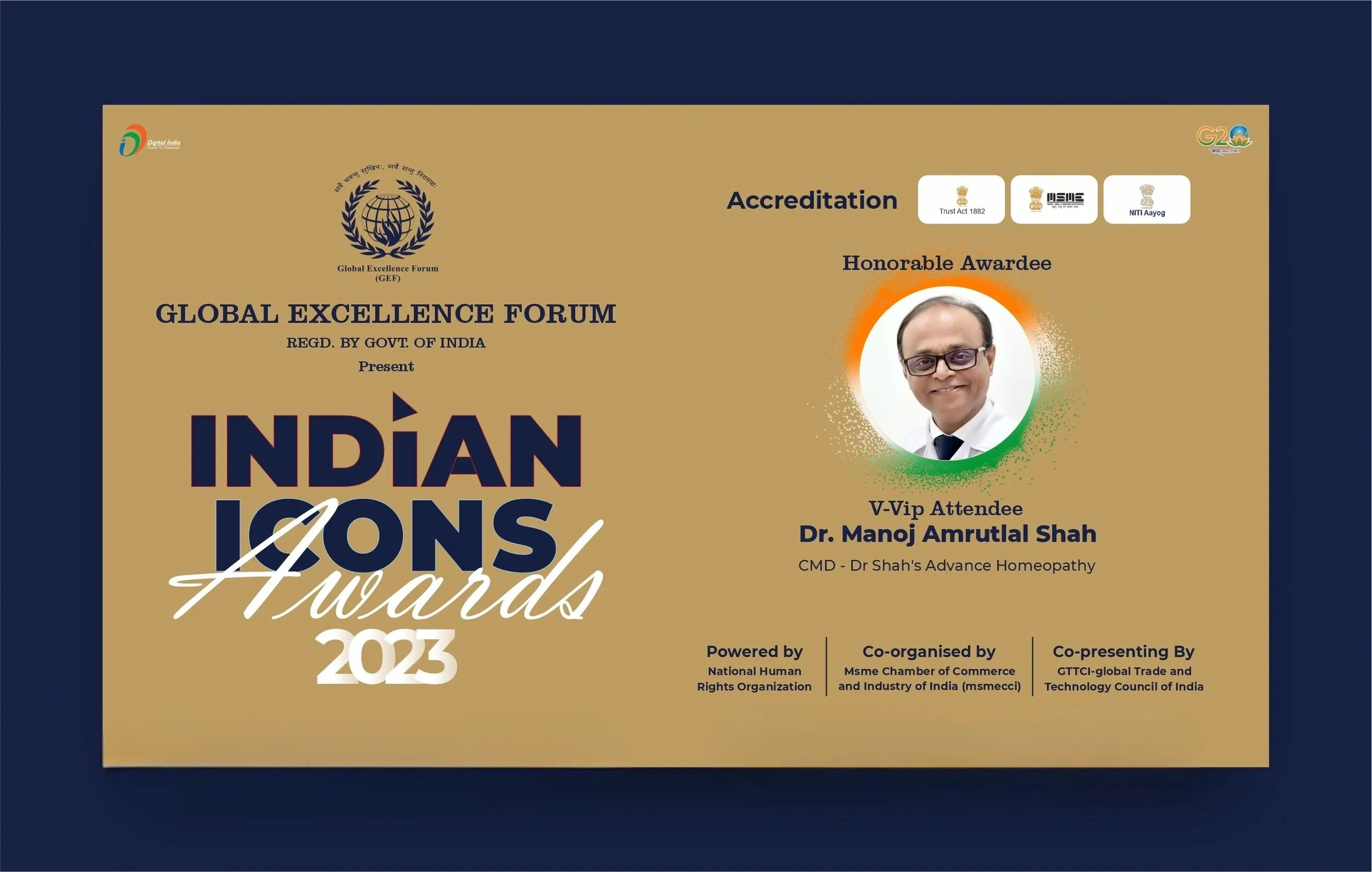 India's Renowned Pune based Homeopath Dr. Manoj Shah Of Dr Shah’s™ Advance Homeopathy Nominated of "INDIAN ICONS AWARD 2023" by GEF New Delhi for Contribution Excellence in Homeopathy treatment for Hair, Skin And Cancer treatment across India And World wide.